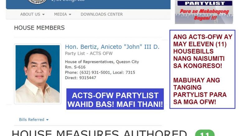 WOW, ANG ACTS-OFW AY MAY ELEVEN (11) HOUSEBILLS NANG NAISUMITI SA KONGRESO! MABUHAY ANG MGA OFW! MABUHAY ANG TANGING PARTYLIST PARA SA MGA OFW!