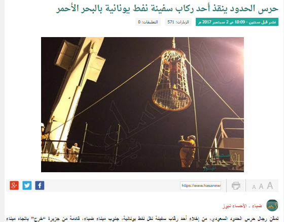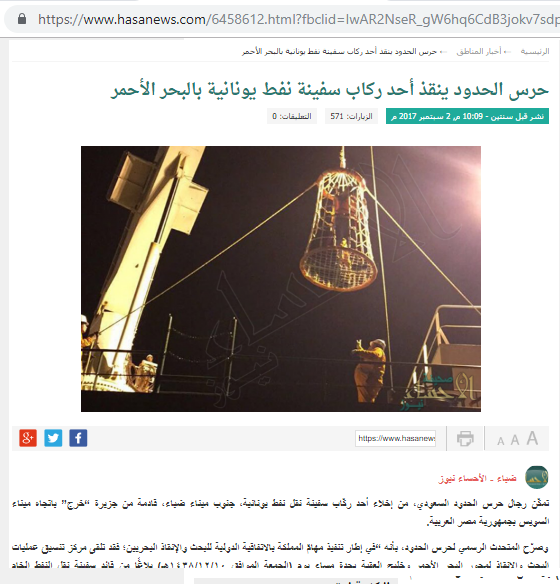 The Saudi border guards managed to evacuate one of the crews of a Greek oil transport vessel south of the port of Daba from the island of Kharj towards the Suez port of the Arab Republic of Egypt.