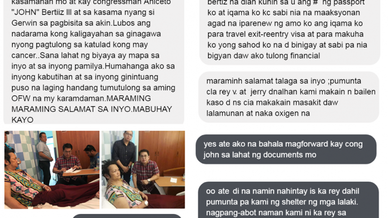 Maraming salamat sa iyo joseph at sa mga kasamahan mo at kay congressman Aniceto “JOHN” Bertiiz lll at sa kasama nyang si Gerwin S. Mcwheng sa pagbisita sa akin.Lubos ang nadarama kong kaligayahan sa ginagawa nyong pagtulong sa katulad kong may cancer..Sana lahat ng biyaya ay mapa sa inyo at sa inyong pamilya.Humahanga ako sa inyong kabutihan at sa inyong ginintuang puso na laging handang tumutulong sa aming OFW na my karamdaman.MARAMING MARAMING SALAMAT SA INYO.MABUHAY KAYO