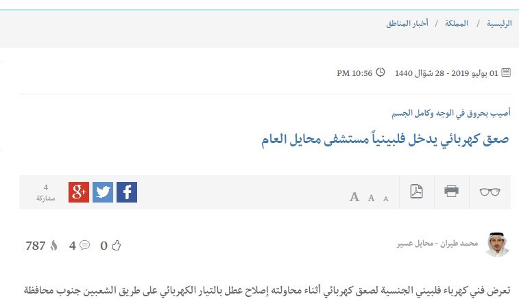 July 01, 2019 – Isang 30-anyos na Pinoy electrician sa Muhayil, Asir Region ay nakuryente habang inaayos ang problemadong linya ng kuryente sa daan.