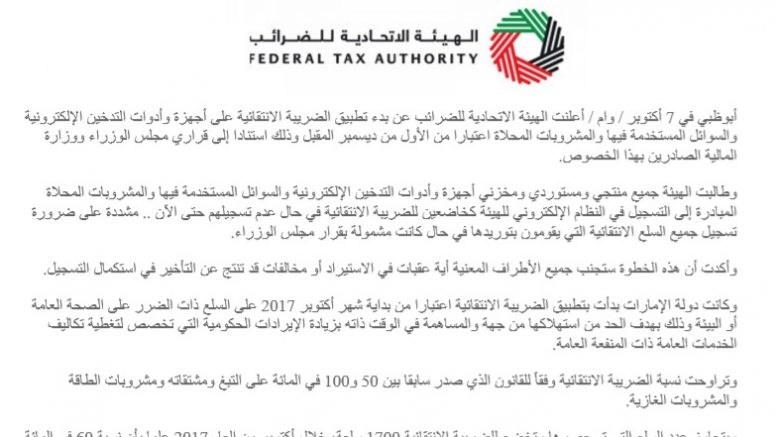 ABU DHABI, October 7 (KUNA) – The Federal Tax Authority (FTA) has announced the introduction of excise tax on electronic smoking devices & liquids, and sweetened beverages starting from December 1, in accordance to the Cabinet and Ministry of Finance decisions issued.