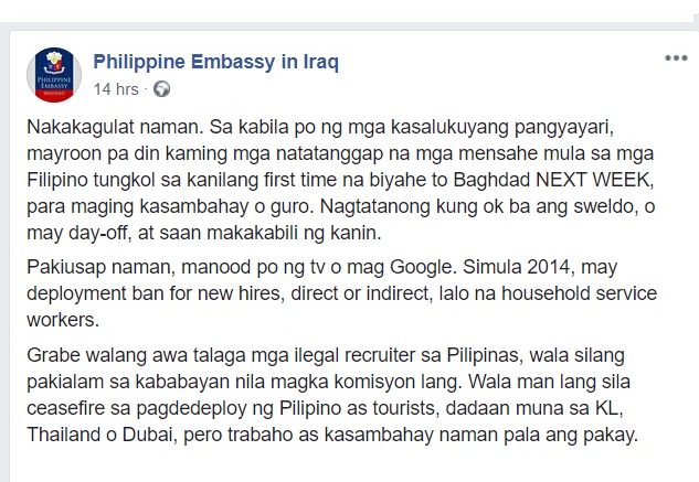 Nakakagulat naman. Sa kabila po ng mga kasalukuyang pangyayari, mayroon pa din kaming mga natatanggap na mga mensahe mula sa mga Filipino tungkol sa kanilang first time na biyahe to Baghdad NEXT WEEK, para maging kasambahay o guro. Nagtatanong kung ok ba ang sweldo, o may day-off, at saan makakabili ng kanin.