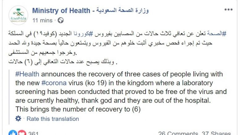 KSA Ministry of Health – وزارة الصحة السعودية announces the recovery of three cases of those infected with the new # Corona virus (Covid 19) in the Kingdom, where a laboratory test has been carried out, proving that they are free of the virus and are currently in good health. Thank God, they are all discharged from the hospital.