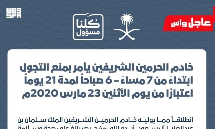 Custodian of the Two Holy Mosques issues curfew order to limit spread of Novel Coronavirus from seven in the evening until six in the morning for 21 days starting in the evening of Monday 23 March