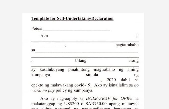 - Kung kayo ay may katibayan, proof o certification na displaced OFW kayo (natanggal sa trabaho o nasa NO WORK NO PAY status), HINDI ninyo kailangan gumawa ng self undertaking/declaration. Ang isubmit ninyo ay inyong katibayan (proof o certification).