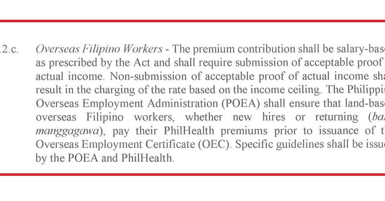 Overseas Filipino Workers – The premium contribution shall be salary-based as prescribed by the Act and shall require submission of acceptable proof of actual income. Non-submission of acceptable proof of actual income shall result in the charging of the rate based on the income ceiling. The Philippine Overseas Employment Administration (POEA) shall ensure that land-based overseas Filipino workers, whether new hires or returning (balik manggagawa), pay their PhilHealth premiums prior to issuance of the Overseas Employment Certificate (OEC). Specific guidelines shall be issued by the POEA and PhilHealth.