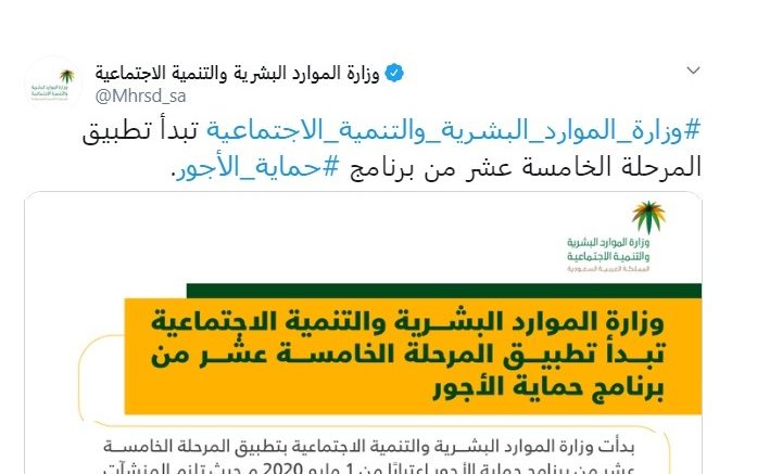 The Ministry called on all establishments concerned with the specified period to commit to paying wages on time and uploading wages payment files approved by the bank with which the employer deals with it on the website of the Ministry of Human Resources and Social Development according to the mechanism of raising the wages files approved and shown on the ministry’s website, and facilities can achieve compliance with program requirements for Through the services provided by the “Mudad” platform approved by the Ministry by visiting its electronic platform at the following link https://mudad.com.sa/