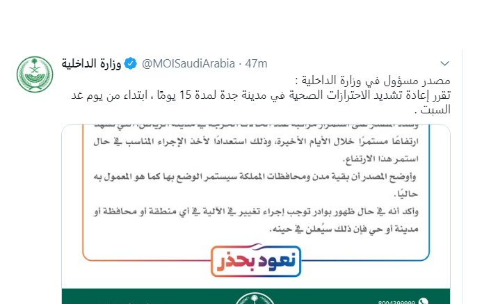 An official source in the Ministry of Interior: It was decided to tighten the health precautions in the city of Jeddah for a period of 15 days, starting tomorrow, Saturday.