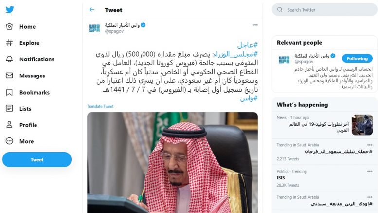 Oktubre 27, 2020: Ang Council of Ministers ng Saudi Arabia sa pamumuno ni Haring Salman bin Abdulaziz al Saud ay nagpasyang magbigay ng 500,000 SAR (katumbas ng 6.4 Million Pesos), sa pamilya ng mga namatay sanhi ng COVID19, na mga HEALTH WORKERS sa government o private sector, Saudi o ibang lahi, military o civilian, sa kondisyon na nalalapat ang pagkamatay ng worker sa petsa mula ng pagtala ng unang impeksyon ng COVID19 noong 7/7/1441 AH (Marso 2, 2020).