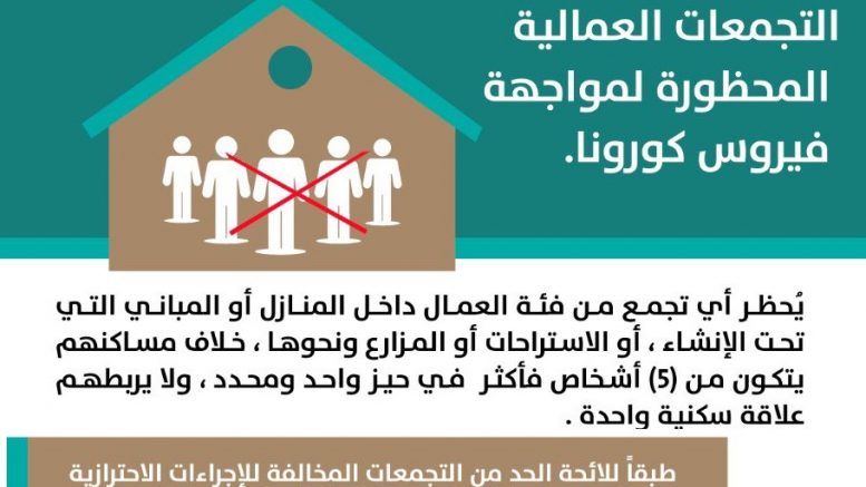 Enero 25, 2021 – Inanusyo ng Ministry of Interior na ang anumang pagpapangkat ng mga manggagawa sa loob ng mga bahay, rest house, farm, at iba pa, bukod sa kanilang mga bahay, na binubuo ng (5) mga tao o higit pa sa isang limitadong espasyo, at hindi sila magkamag-anak, ay lumalabag sa regulasyon sa paglilimita sa mga pagtitipon.