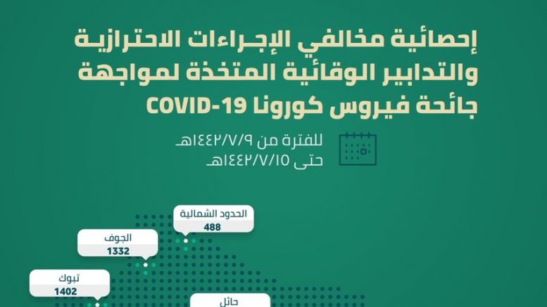Pebrero 28, 2021 – Ang Ministry of Interior ng Kingdom of Saudi Arabia ay nag-anunsiyo na sa loob ng isang linggo (mula Pebrero 21, 2021 hanggang Pebrero 27, 2021), sila ay nakapagtala ng 43,428 bilang ng violators sa preventive measures and protocols para labanan ang pagkalat COVID19.