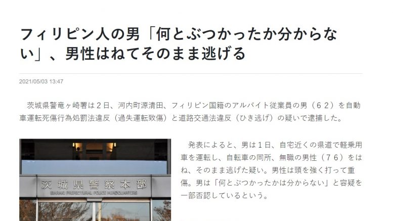 On May 2, the Ibaraki Prefectural Police Ryugasaki Station arrested a man (62), a part-time employee of Kawachi Town Genseida, a Filipino national, on suspicion of violating the Act on Punishment of Car Driving Injury (Negligent Driving Injury) and the Road Traffic Act (Hit and Run).