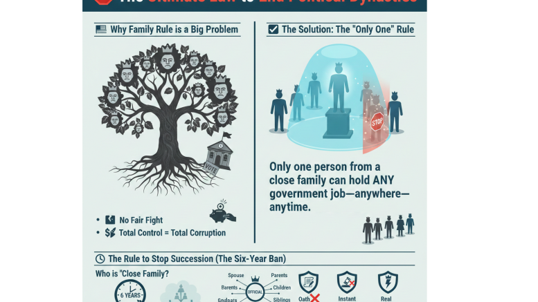To completely stop family control, we need a simple, absolute rule: Only one person from a close family can hold any government job—anywhere—at any time.