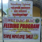 Sa tulong ng Fil Mo DHA o Filipino Modern Day Heroes Association, at sa pagbibigay oportunidad ni Kagawad Melissa Carabeo ng Baranggay West Bajac-Bajac na makatulong ang Isang Minutong SMILE sa proyektong ito, naging matagumpay ang unang Feeding Program sa nasabing paaralan.